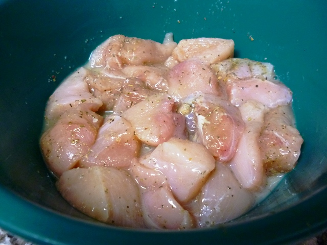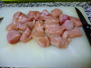 Corte os peito de frango em cubos.