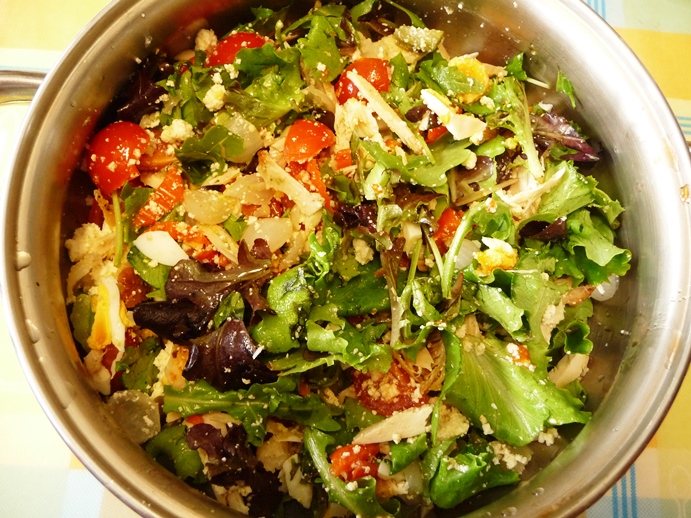 Alface, rúcula, tomate, queijo fresco e/ou requijão, ovo cozido, atum e/ou frango. Temperada com sal, azeite, vinagre balsâmico e orégãos.